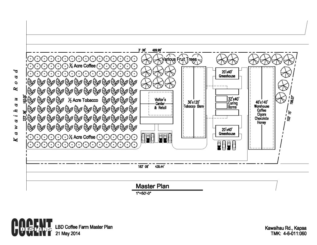 Blair Estate is expanding: We’ve bought two road front agriculturally zoned acres on Kawaihau Road in Kapaa where we will consolidate the farm processing operations that are currently scattered among various locations on Kauai. We’ve already cleared and planted a portion of the land, and construction is scheduled to begin in the spring on a comprehensive farm, retail and visitor center complex, which will include an agricultural processing center, tobacco barns, greenhouses, kilns, warehouse space and administrative offices so that the Drent family can at last have their home back (though no doubt they’ll miss the aroma of roasting coffee wafting up from their bottom floor). The public will be invited to come to the visitors center, where they can tour the farm and see how we grow and process our crops into chocolate, coffee and cigars as well as purchase our products.